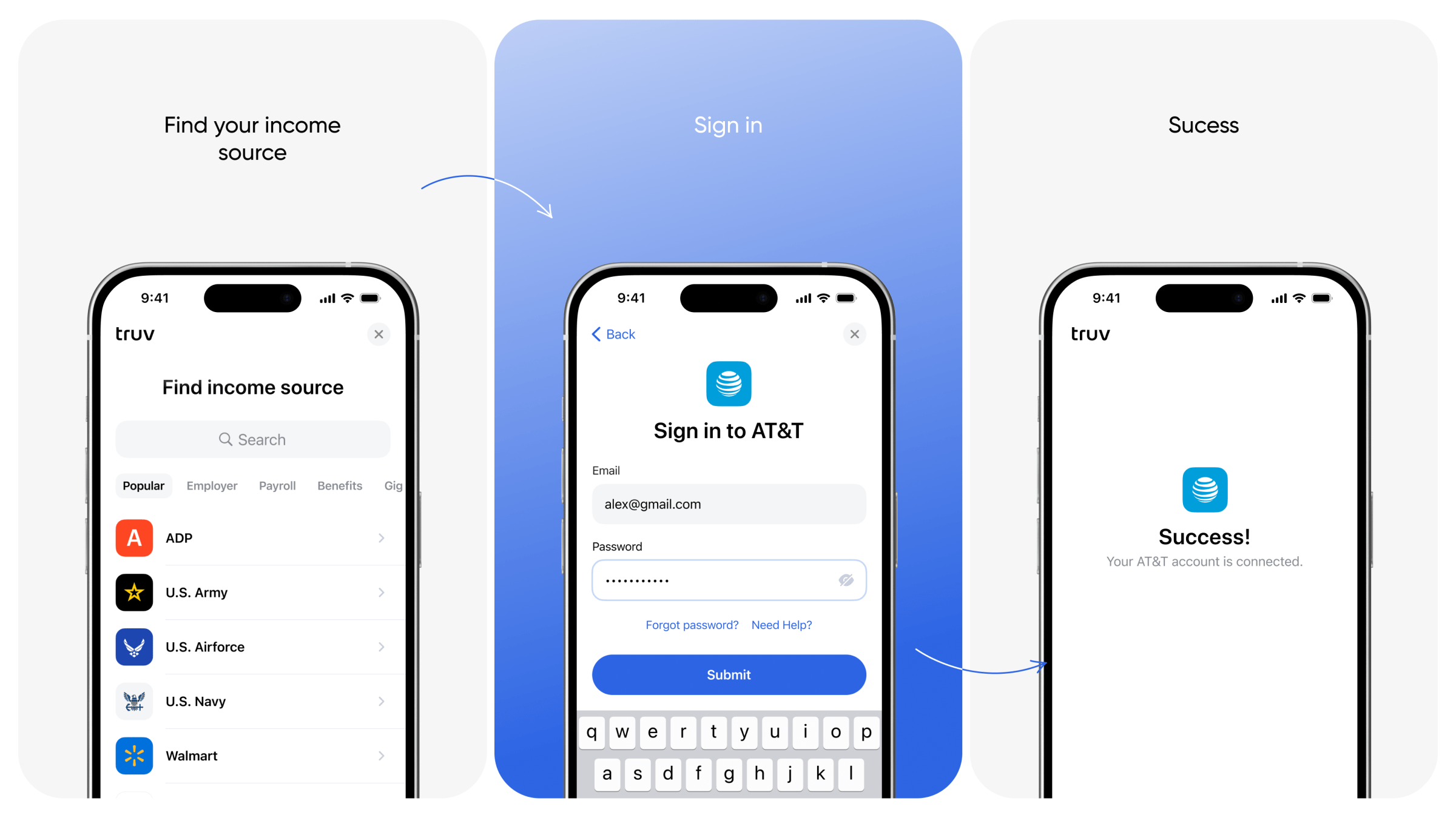 - The Truv platform securely retrieves the data and shares it with the requesting party (lender, employer or landlord).