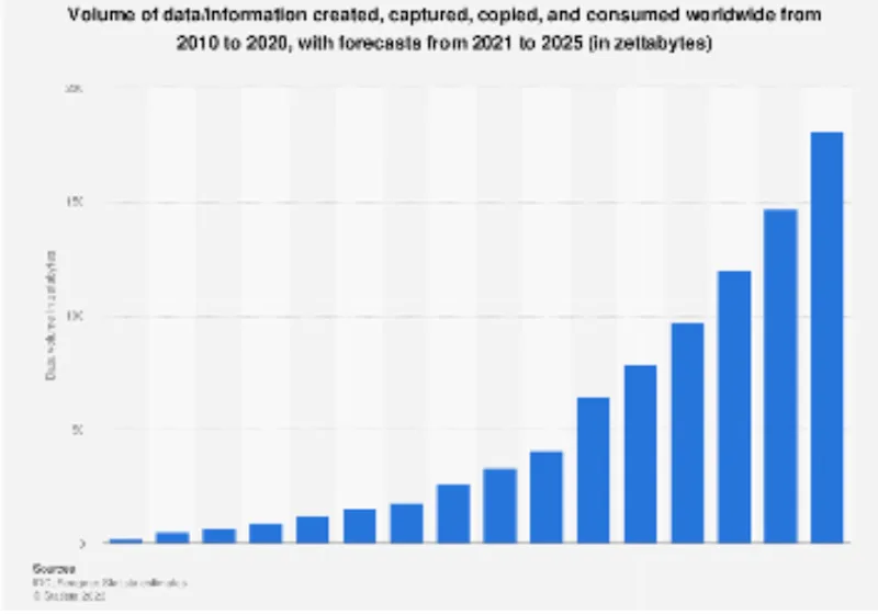A graph of the volume of data information created, captured, copied, and consumed (e.g., aggregated data) wordwide from 2010 to 2020.