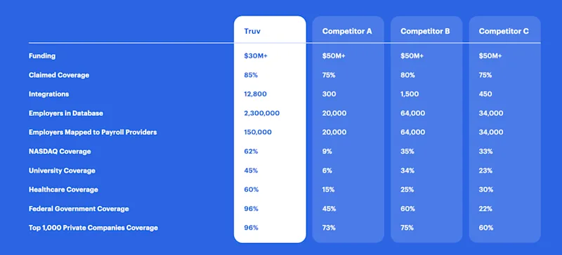 Below, you’ll see an objective analysis we conducted featuring Truv and three other providers in the space. The results show why Truv has won 90% of A/B tests that have been conducted with competitors.