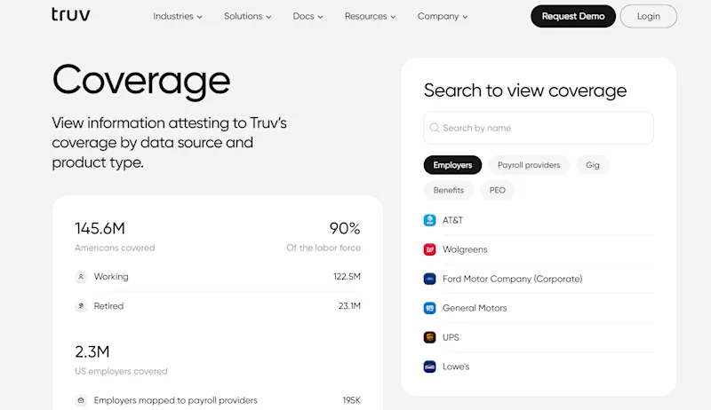 Truv defines coverage as the number of end-users who can access their data via our platform, which is only limited by the number of payroll systems that Truv is integrated with. It’s easiest to identify what you need based purely on whether a vendor covers a specific category of companies you need such as: public companies, NASDAQ, private companies, gig economy, retirement, disability, etc. Be sure to check out each vendor’s coverage page. Below is Truv’s: