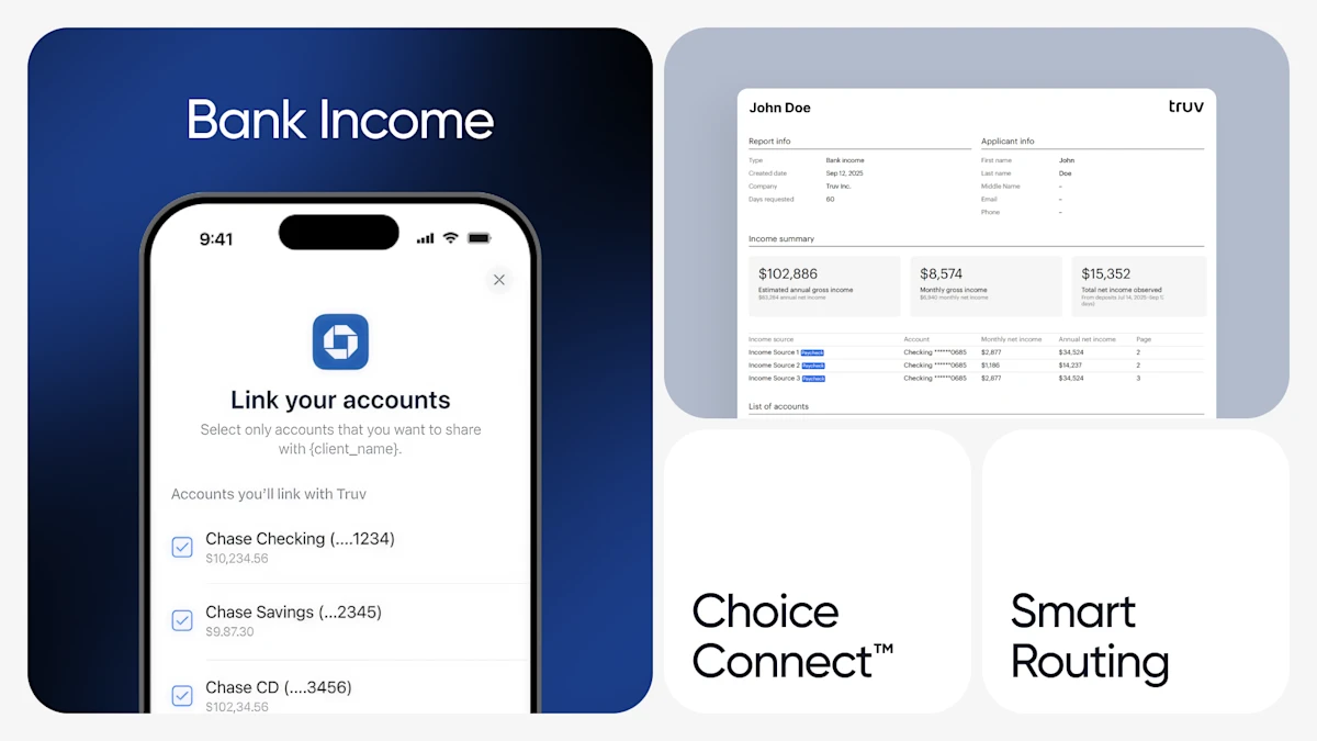Truv Bank Income is built into our Truv Choice Connect™ and Truv Smart Routing experience — a unified verification workflow that brings together Payroll, Bank, and Document Upload sources in a single embeddable widget.