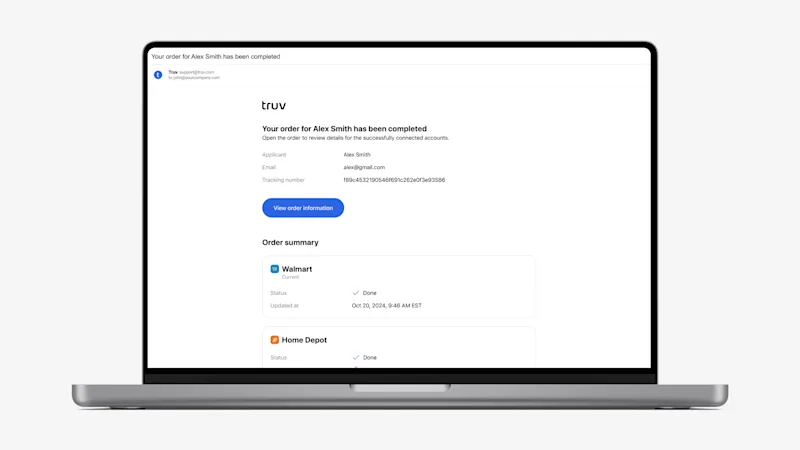 - Order-Level Status Update Emails: Status update emails for orders have been improved. Instead of sending separate emails for each employer when a suborder reaches a terminal status (Completed, Expired, Canceled, Skipped, User, or No Data), Truv now sends one consolidated update. This includes status information for all parts of the order, including those still in progress (Pending, Sent, or Skipped), showing: company/provider, last attempt results, attempt counts, and timestamps. This gives Order Managers better visibility on order progress and information to guide users toward completion or alternative verification paths.