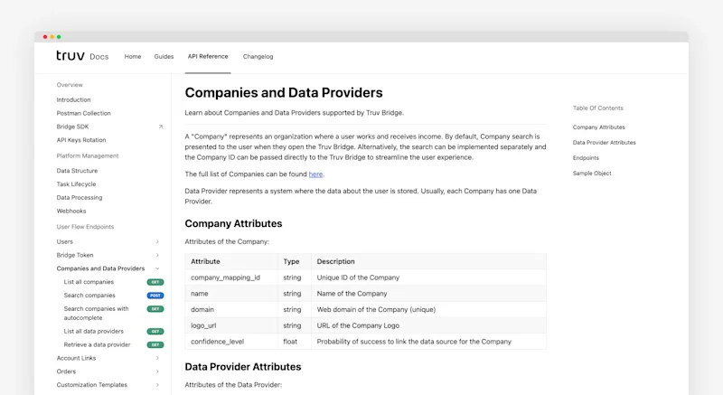 During implementation, it’s important to validate Truv’s coverage of integrations for various products. To provide complete clarify here, we’ve opened up our data provider endpoints for our customers to quickly identify integrations associated with various products. This enables our customers to cut through marketing buzz in the industry to reality on coverage, and you can quickly validate if an important provider is covered or not.