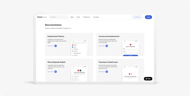 We recognize how tedious vendor integrations can be. In an effort to make this more seamless, we have revamped Truv docs to help guide you through the integration. Now you can find best practices on how to embed Truv’s widget into your workflow, detailed data schema and responses, implementation guides all in one place. Check Out Truv Docs