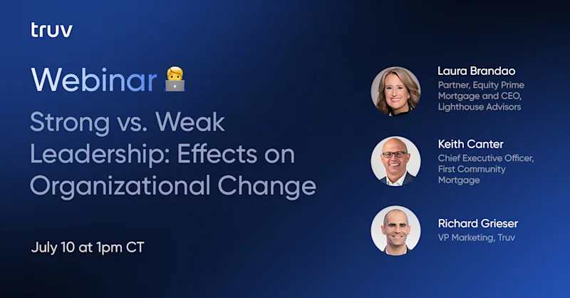 On July 10, 2024 at 2 PM EST, join esteemed industry leaders, Laura Brandao of Equity Prime Mortgage, Keith Canter of First Community Mortgage, and Richard Grieser of Truv as they share their wealth of knowledge from over 40 years of combined leadership experience in the mortgage and business sectors. Gain valuable insights on leadership dynamics and discover strategies to elevate your business to new heights.