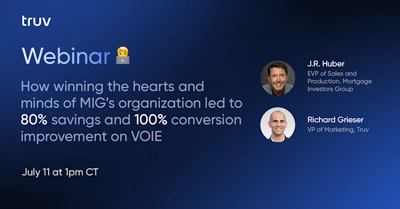 On July 11, 2024 at 2 PM EST, tune in to hear Mortgage Investors Group share their experience with Truv, from savings to how they changed their tech stack, rolled out the solution to the organization, and gained adoption from their operations, sales and production teams.