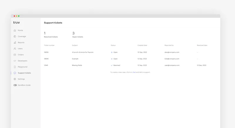 In the Client Dashboard, clients will now see a menu option for “Support tickets”, where they will find a view of all open, pending and resolved support tickets, improving the overall client experience. This provides clients or Truv’s partners with a comprehensive overview of all support tickets submitted in one place including updates and status of each tickets. Explore
