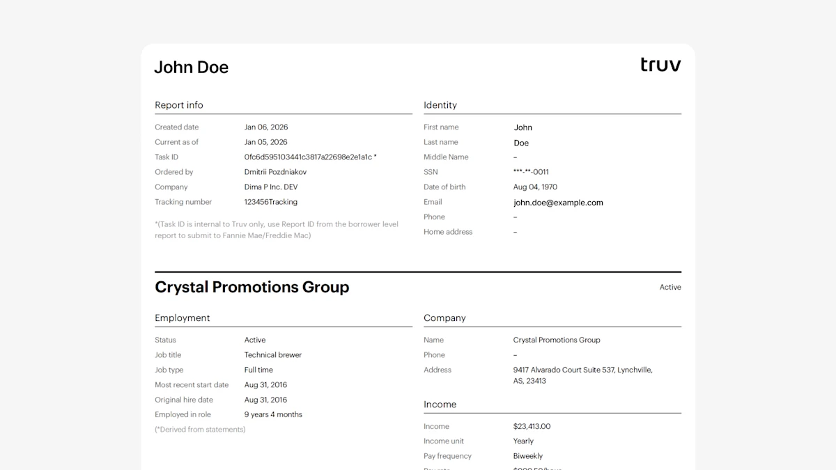 - Updated Employer Report Design: Truv has updated the format and design of the link-level reports (aka employer report) to match the formatting of the user-level reports (aka borrower report).